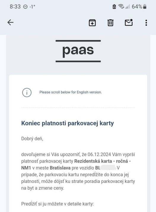 „Dnes som si našla tento e-mail od PAAS. Zarazilo ma, že ak nezaplatím do termínu konca platnosti karty, stratím poradie parkovacej karty a hlavne cena bude vyššia. Prosím? Som rezident, aké poradie stratím?To je prosím vás čo toto? Momentálne nie som doma a nebudem až do konca roka. Čiže som si chcela zaplatiť parkovanie až v čase, keď sa vrátim. A toto ma núti platiť, aj keď neparkujem,“ vraví Katarína, ktorej upozornenie od PAAS prišlo.