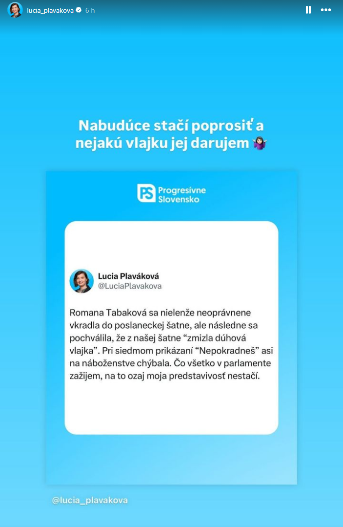 Zdroj: Instagram/ lucia_plavakovaIncident však vyvolal aj vážnejšie otázky. Plaváková v svojom statuse poznamenala, že Tabák by si zrejme mala zopakovať siedme prikázanie „Nepokradneš“. Dodala, že takéto správanie len ilustruje atmosféru, ktorá momentálne panuje v parlamente: „Čo všetko v parlamente zažijem, na to ozaj moja predstavivosť nestačí,“ okomentovala poslankyňa.