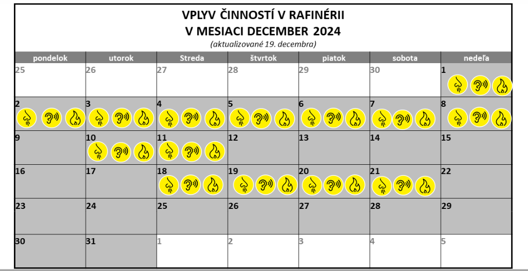 Zábery, ktoré zverejnil profil zdronu, boli natočené týždeň pred Vianocami, kedy mal Slovnaft plánované spaľovanie. „Všetky činnosti sú plánované, riadené a nie sú nebezpečné pre život obyvateľov. Cieľom spoločnosti Slovnaft je skrátiť negatívne vplyvy činností znižujúcich pohodlie obyvateľov žijúcich v okolí rafinérie na nevyhnutné minimum,“ uvádza spoločnosť na svojom webe.