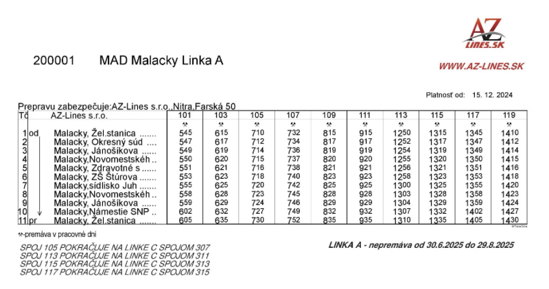 Podľa pôvodného cestovného poriadku, ktorý ešte donedávna visel na stránke mesta Malacky, mala dopravu naďalej zabezpečovať Arriva. Na miestnych stránkach ani vo vyhľadávači spojov nebolo zmienky o zmene dopravcu. Napokon sa však objavil nový rozpis jázd, ktorý už uvádza AZ Lines ako hlavného prevádzkovateľa mestskej hromadnej dopravy.