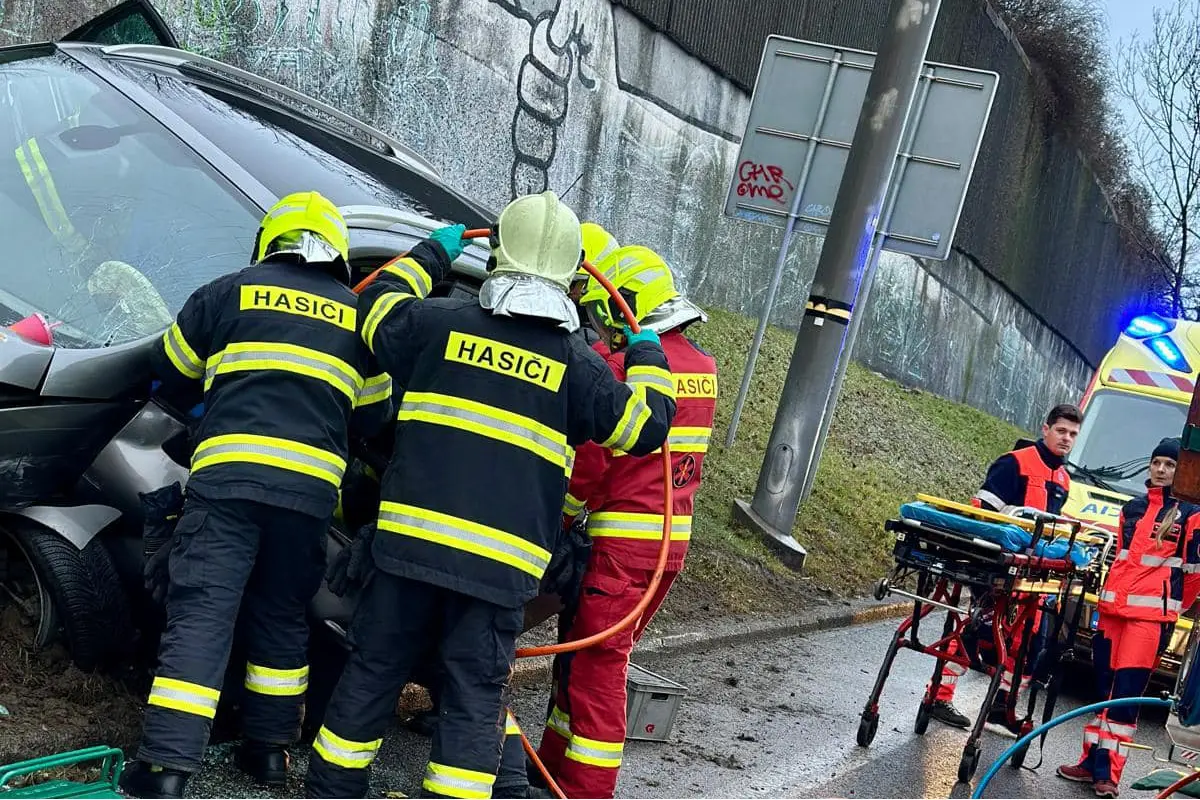 FOTO: Pri dopravnej nehode v Bratislave zasahovali hasiči aj záchranári, z auta vyslobodzovali zakliesneného človeka