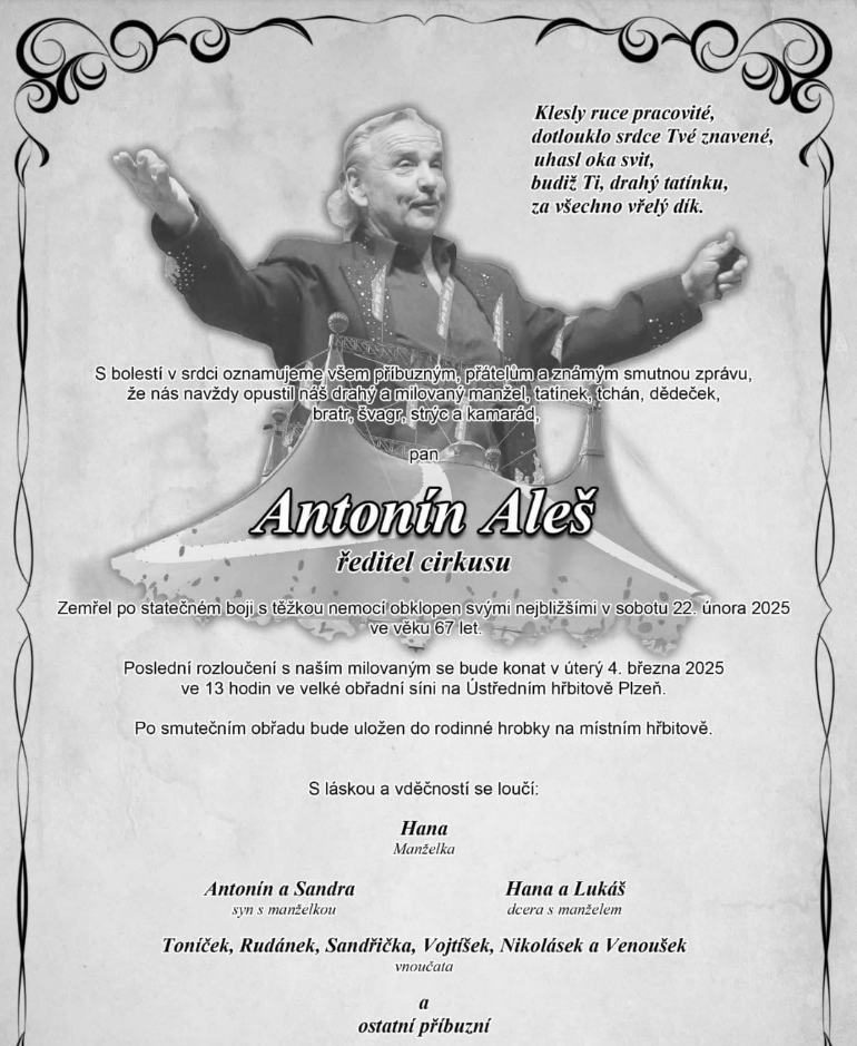 Včera, 23.2.2025, vo veku 67 rokov zomrel riaditeľ najväčšieho československého cirkusu, Antonín Aleš. Aleš sa práci v cirkuse venoval od mladého veku a za svoj život si vyskúšal niekoľko umení. V dojemnom príspevku cirkus Aleš píše, že sa vždy práci venoval na 100-percent a jeho najväčšou vášňou boli zvieratá.