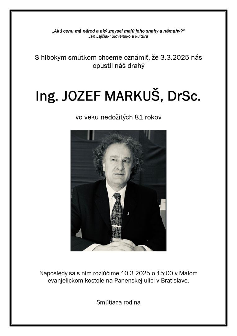 „S hlbokým zármutkom oznamujeme, že nás vo veku nedožitých 81 rokov navždy opustil Jozef Markuš, výrazná osobnosť slovenskej kultúry a dlhoročný predseda Matice slovenskej. Správu potvrdila jeho dcéra Zora Jaurová. Jozef Markuš bol významný ekonóm, národohospodár, prognostik, politik, verejný činiteľ, kultúrny pracovník, publicista, esejista, spisovateľ a spoluzakladateľ Slovenskej republiky,“ píše Matica Slovenská v príspevku.