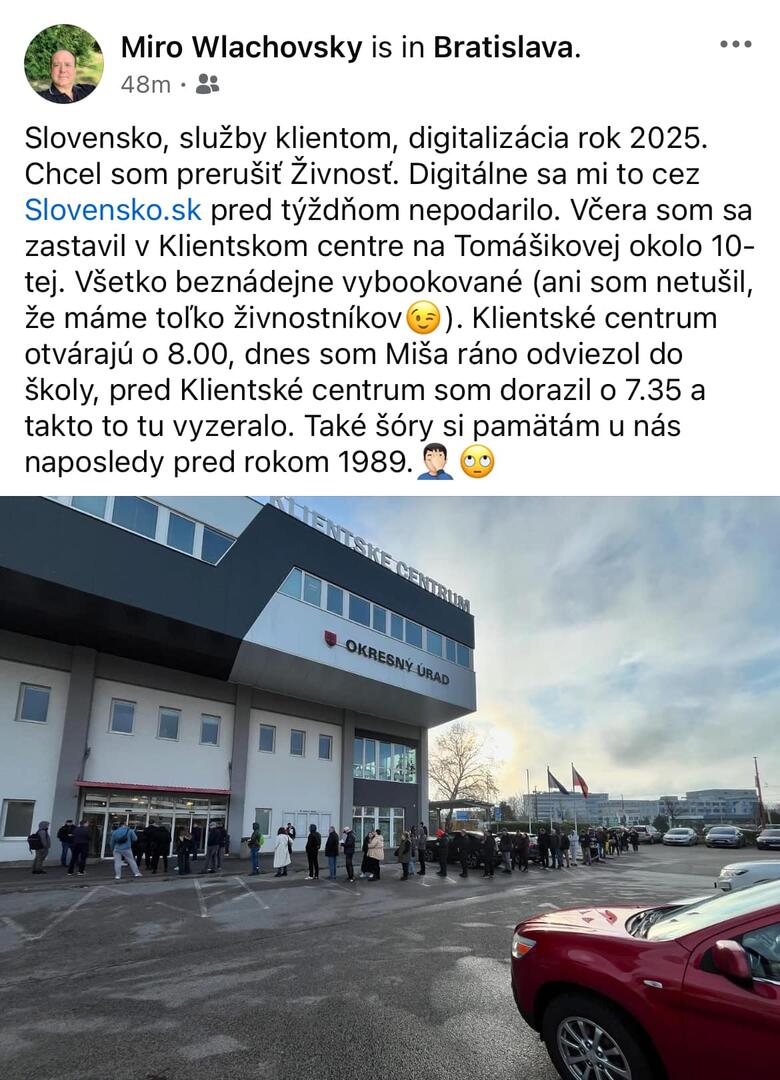 „Včera som sa zastavil v klientskom centre na Tomášikovej, okolo 10-tej. Všetko beznádejne vybookované (ani som netušil, že máme toľko živnostníkov). Klientske centrum otvárajú o 8:00 hod., dnes som Miša ráno odviezol do školy, pred klientske centrum som dorazil o 7:35 hod. a takto to tu vyzeralo. Také šóry si pamätám u nás naposledy pred rokom 1989,“ napísal na sociálnom médiu bývalý minister zahraničných vecí počas úradníckej vlády Miroslav Wlachovský.