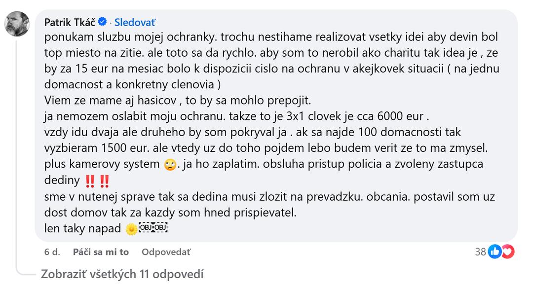 „Ponúkam službu mojej ochranky. Trochu nestíhame realizovať všetky idey, aby bol Devín top miesto na žitie. Ale toto sa dá rýchlo. Aby som to nerobil ako charitu, tak idea je, že by za 15 eur na mesiac bolo k dispozícii číslo na ochranu v akejkoľvek situácii. Viem, že máme aj hasičov, to by sa mohlo prepojiť,“ píše Patrik a dodáva, že by jeho ponuka sumy 15 eur platila pre jednu domácnosť a na jej konkrétnych členov.