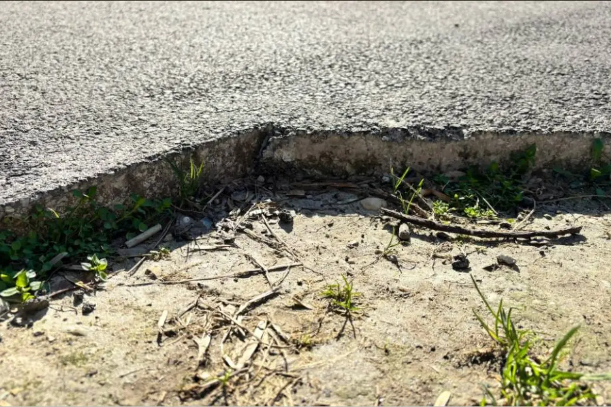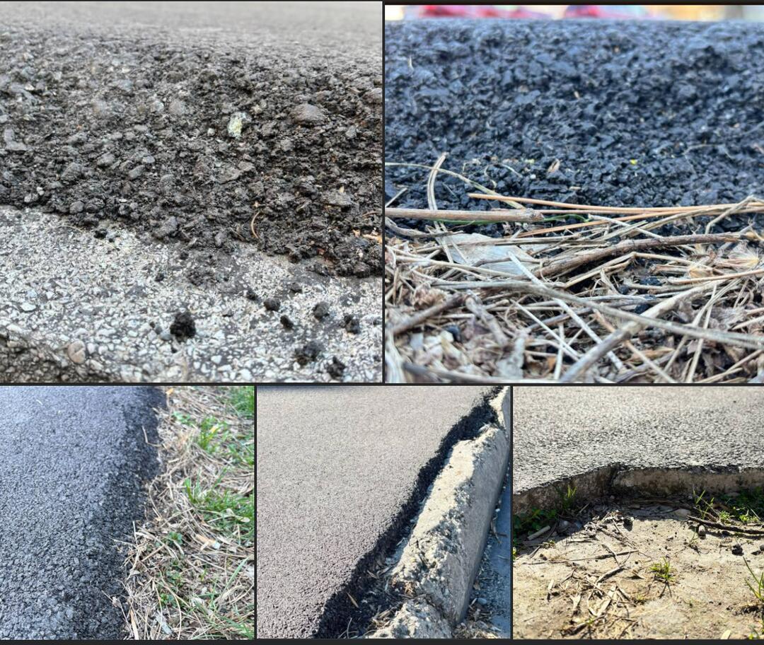 K jeho príspevku pridal aj fotky nedávno dokončených prác. Niektoré kraje chodníkov zasahujú hlboko do trávy, inde asfalt presahuje obrubníky, ktoré majú oddeľovať chodník od cesty.