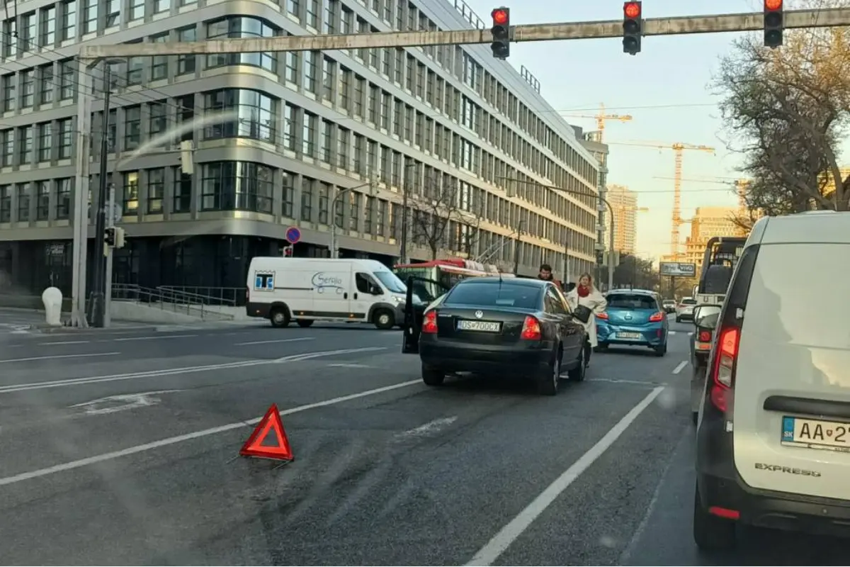Nehoda je aj v Bratislave na križovatke Prievozská × Turčianska smerom do centra, kde sa na semaforoch zrazili dve autá. Blokujú jeden pruh.