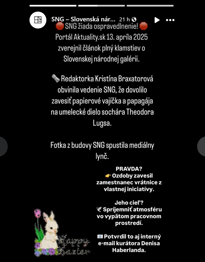 Kauza, ktorá začala ako zdanlivo nevinná veľkonočná výzdoba, však odhalila viac než len estetický prešľap. Reakcia SNG – najprv ticho, potom stiahnutie diela a napokon výpad voči médiám – pôsobí ako zlyhanie v základnej komunikačnej stratégii. Namiesto prevzatia zodpovednosti alebo aspoň vysvetlenia situácie s nadhľadom, galéria útočí na médiá, ktoré na problém upozornili ako prvé.