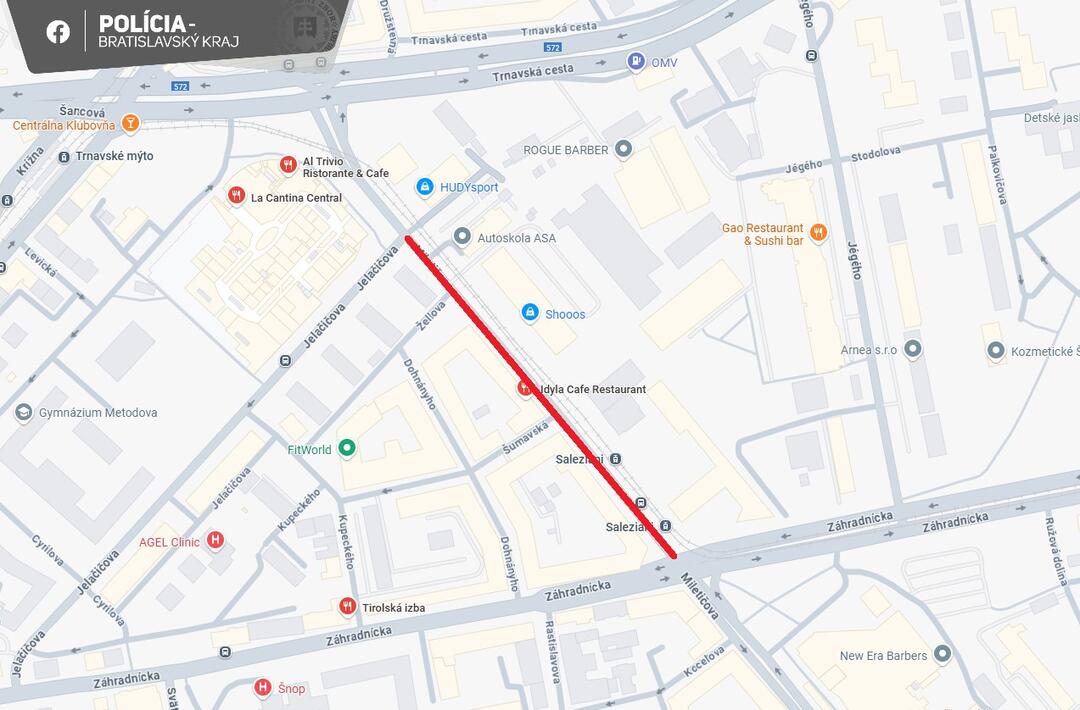 V súvislosti s týmto dopravným obmedzením bude Miletičova ulica v úseku od Jelačičovej po Záhradnícku ulicu zjednosmernená – prejazd bude možný len v smere od Trnavskej cesty na Záhradnícku. V opačnom smere bude ulica neprejazdná.
