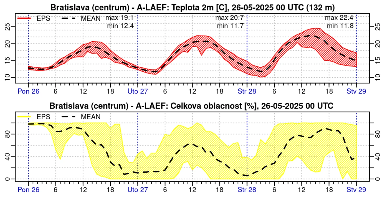 Najvyššia denná teplota v Bratislave dosiahne 19 stupňov Celza a počas noci sa ochladí na 12 stupňov Celzia. Popoludní začne na Slovensko z Moravy postupovať studený front, ktorý prinesie ochladenie, prvé prehánky a búrky. Tie najprv zasiahnu Česko a Rakúsko, u nás sa podľa iMeteo plne prejavia až po 14:00 hod.