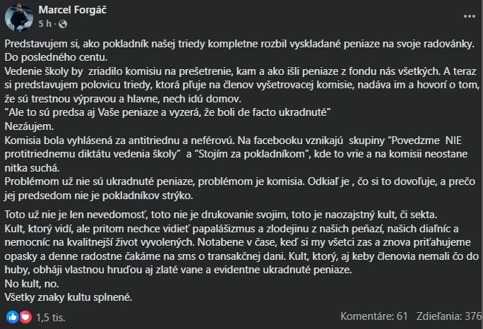 „Predstavujem si, ako pokladník našej triedy kompletne rozbil vyskladané peniaze na svoje radovánky. Do posledného centu,“ začína Forgáč svoju satiru. A pokračuje: „Komisia bola vyhlásená za antitriednu a neférovú. Na Facebooku vznikajú skupiny 'Povedzme NIE protitriednemu diktátu vedenia školy' a 'Stojím za pokladníkom'.“