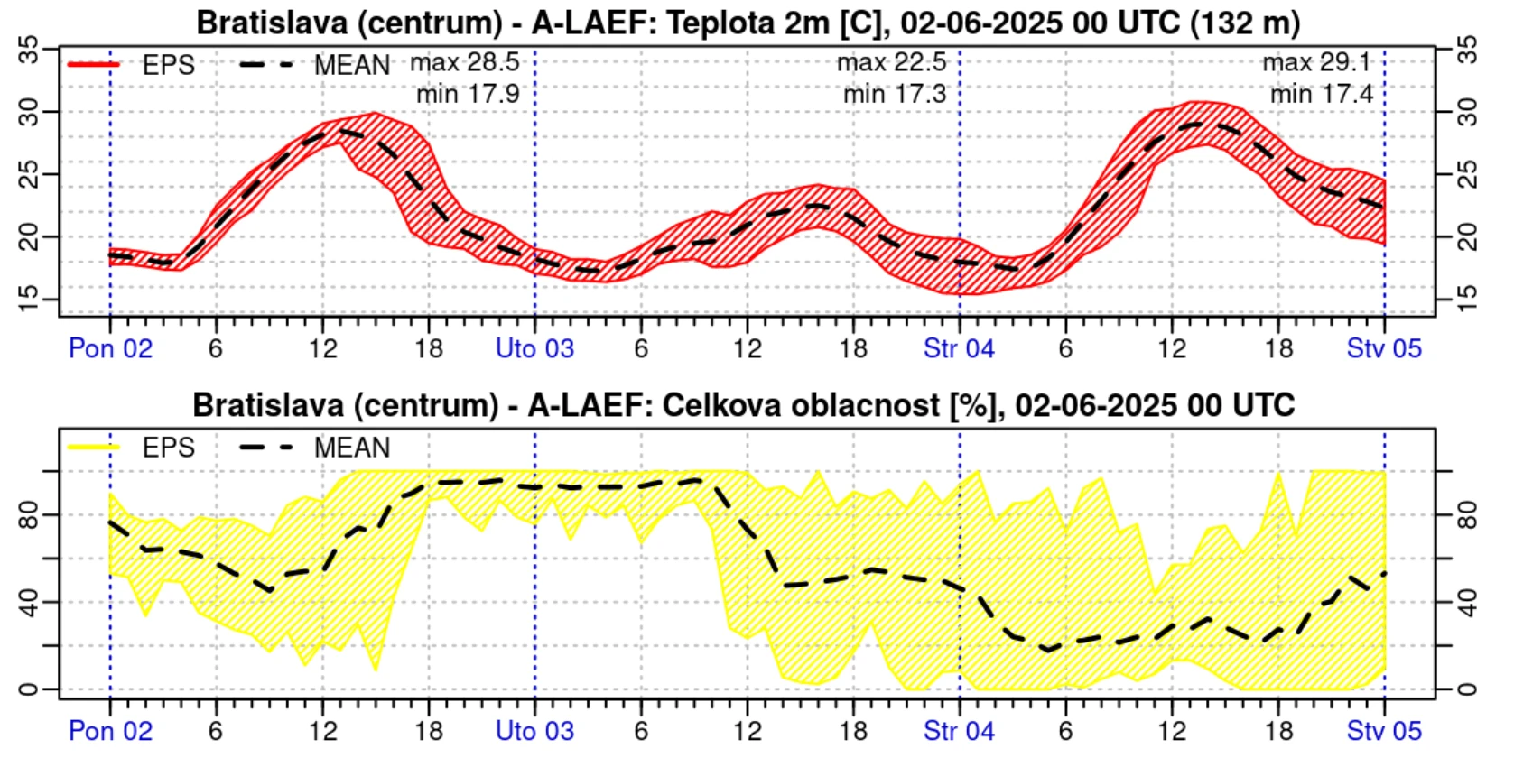 Rovnaké výstrahy budú platiť aj počas utorka. Počas pondelka najvyššia denná teplota v Bratislave dosiahne 28,5 stupňa Celzia. Stane sa tak okolo 15:00 hod. Najnižšia teplota klesne na 17,9 stupňa Celzia o polnoci.