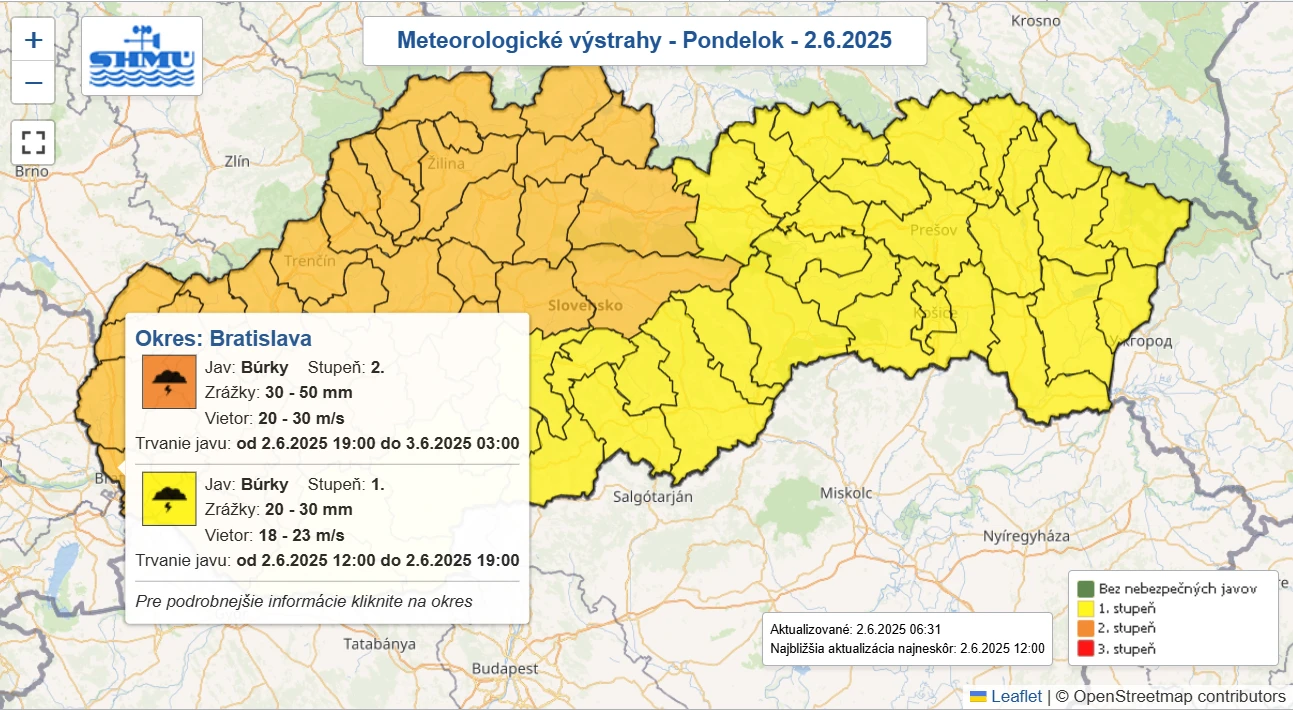 V poobedňajších hodinách hrozia na území Bratislavského kraja búrky z tepla. Teploty počas víkendu prvýkrát dosiahli takmer 30 stupňov Celzia a prinieslo so sebou aj prvé dažde. Meteorológovia vydali výstrahy pred búrkami. V celom kraji platí výstraha druhého stupňa od 12:00 hod. do 19:00 hod.