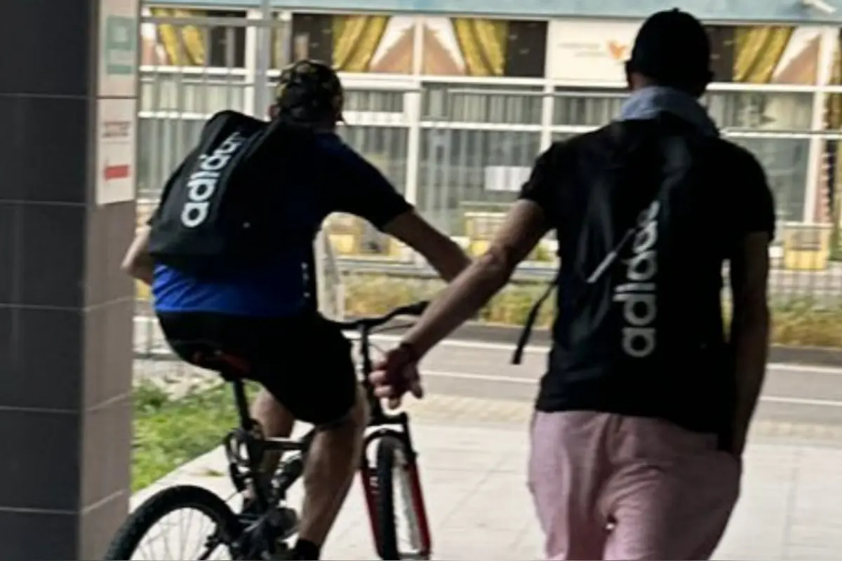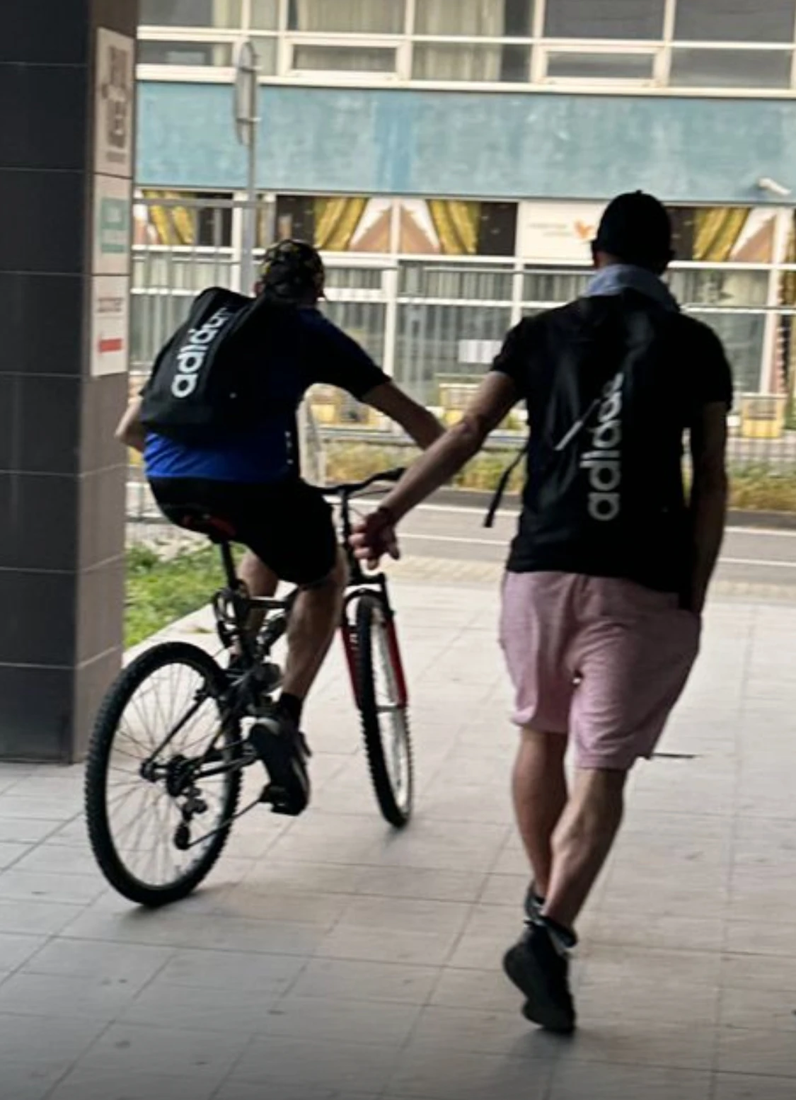 Na fotografii vidno dvoch mužov, jeden ide na bicykli, druhý kráča vedľa neho. Obaja majú šiltovky a na chrbtoch čierne ruksaky značky Adidas – presne ako ich opisoval aj Lacko v pôvodnom príspevku.