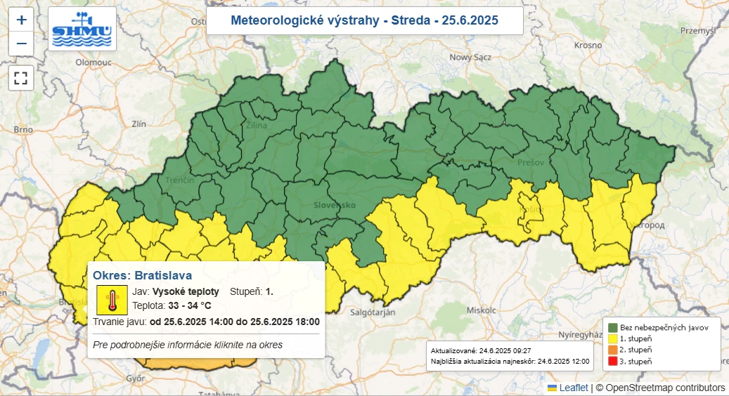 „V okrese Bratislava sa očakáva miestami dosahovanie maximálnej teploty vzduchu 33 - 34 °C. Vysoká teplota predstavuje potenciálne nebezpečenstvo pre ľudské zdravie, fyzické aktivity a tvorbu požiarov. Uvedená teplota vzduchu nie je v danej ročnej dobe a oblasti nezvyčajná, ale pravdepodobnosť nadmerného zaťaženia organizmu u niektorých osôb je vysoká,“ uvádza SHMÚ.