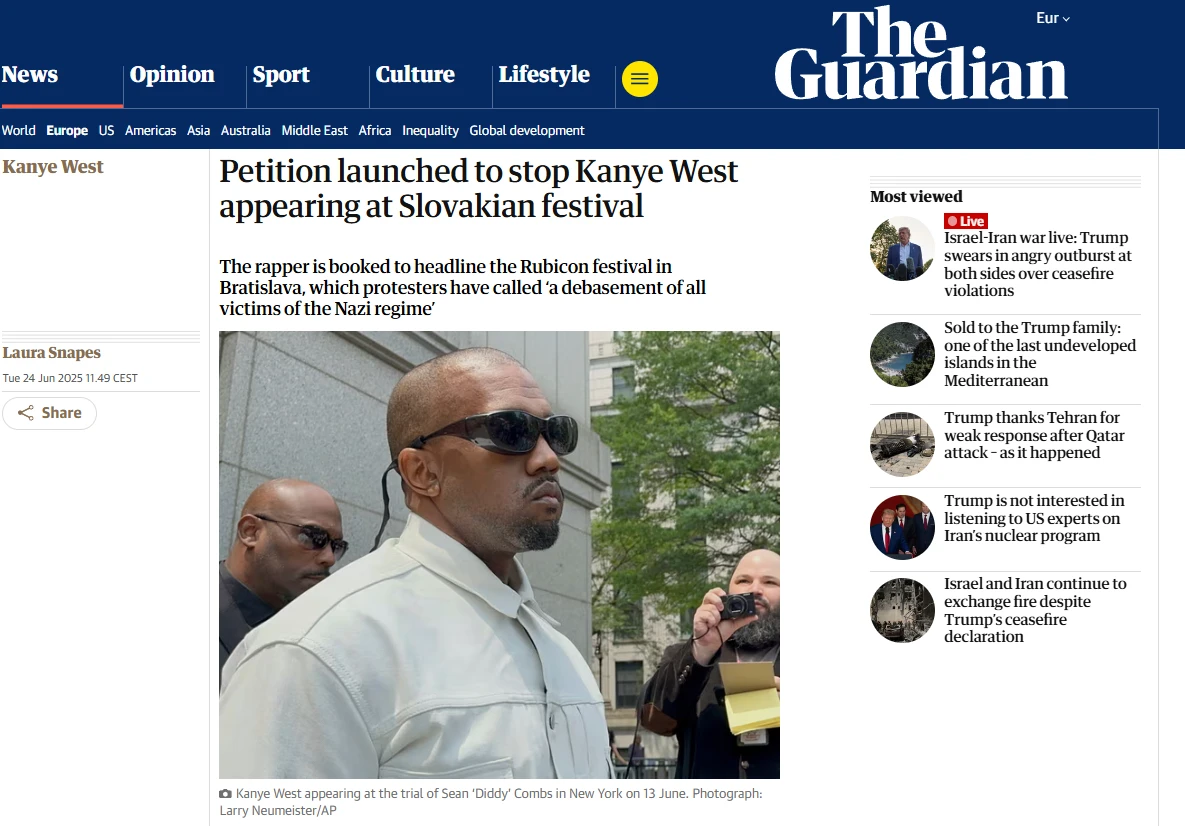 Petíciu proti koncertu kontroverzného rapera Kanye Westa v Bratislave si všimol aj britský The Guardian