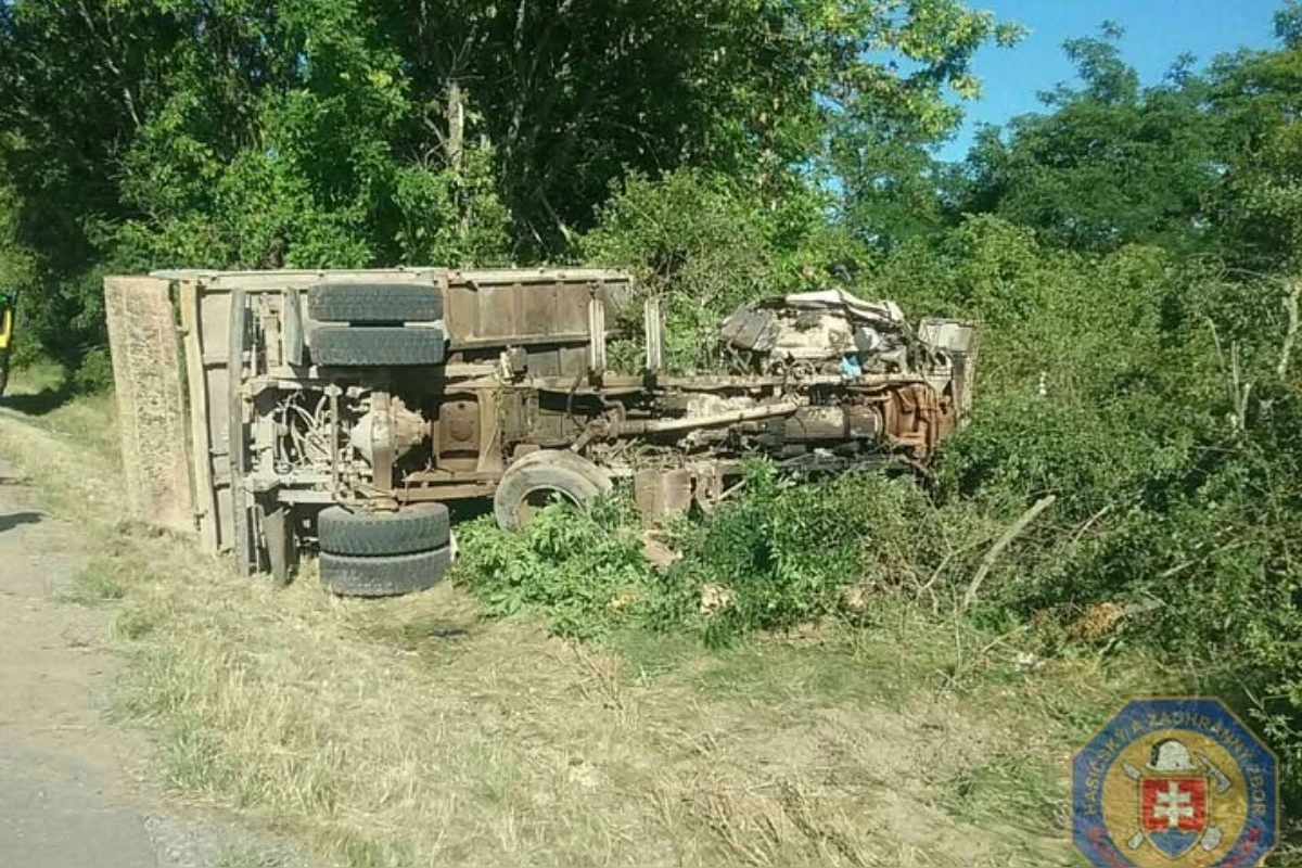Hrôzostrašná nehoda za Budmericami. Nákladné vozidlo sa prevrátilo a skončilo mimo cesty