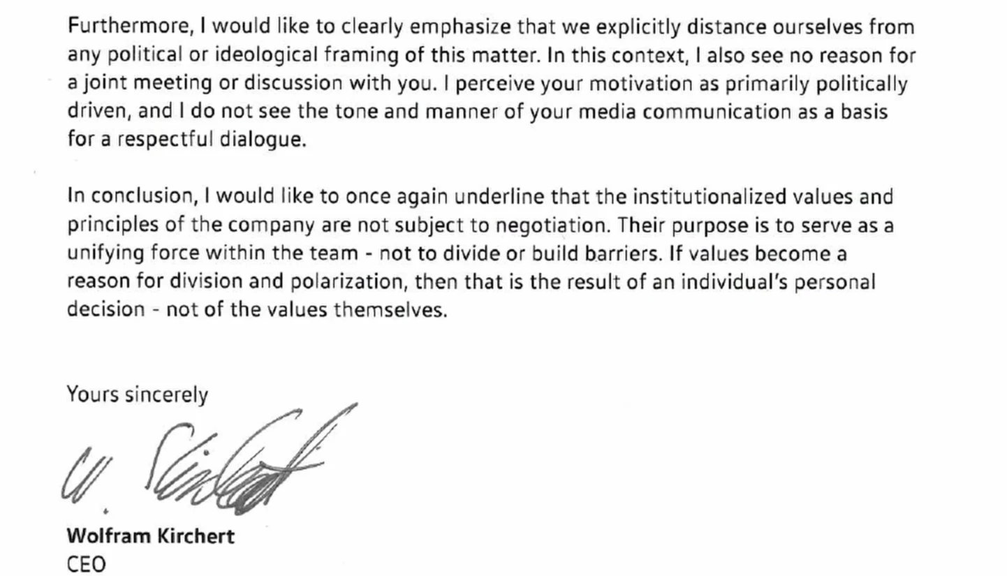 Generálny riaditeľ Volkswagenu Wolfram Kirchert v liste adresovanom europoslancom uvádza, že sa ako firma dištancujú od akéhokoľvek politického či ideologického rámca. „V tomto kontexte nevidím dôvod na stretnutie s vami. Vašu motiváciu vnímam ako čisto politickú a spôsob komunikácie, ktorý v médiách využívate, neponúka základ pre rešpektujúci dialóg,“ píše Kirchert v liste, ktorý europoslanci zverejnili.
