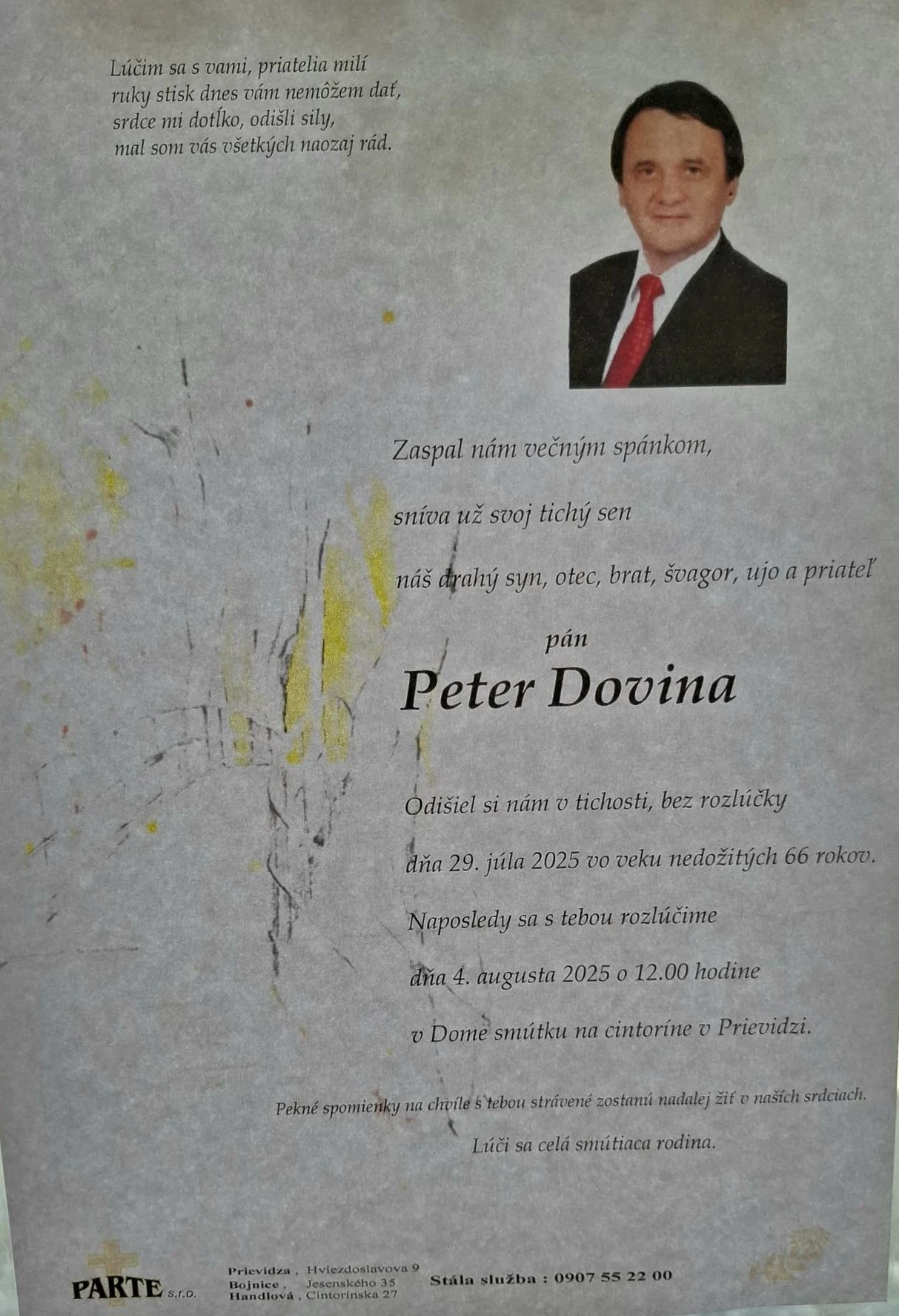„Včera náhle zomrel náš bývalý kolega Peter Dovina. V redakcii Obrana pracoval ako fotograf v rokoch 1995 až 2005 a po približne dvojročnej prestávke do roku 2011. Stal sa tak fotokronikárom budovania našich Ozbrojených síl Slovenskej republiky.“