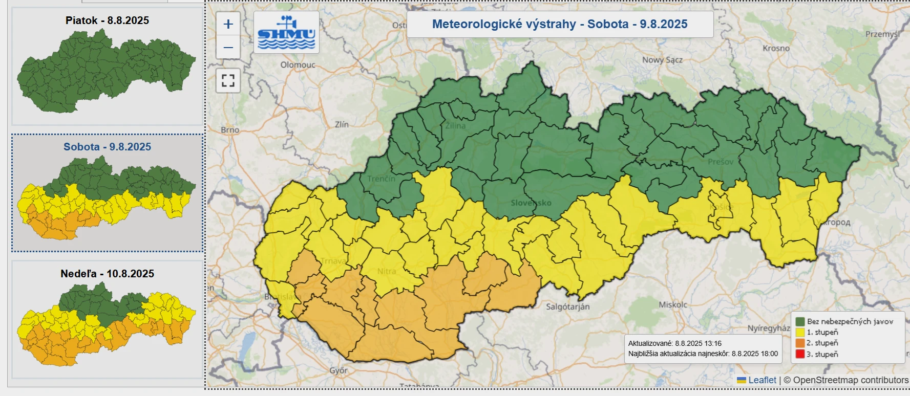 Ešte vyššie teploty predpovedajú meteorológovia na nedeľu, keď sa ortuť teplomera môže vyšplhať až na 35 až 36 °C. V čase od 14:00 hod. do 18:00 hod. preto platí výstraha 2. stupňa, ktorá predstavuje zvýšené riziko poškodenia zdravia v dôsledku nadmerného zaťaženia organizmu.