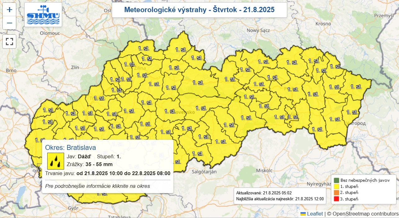 Po horúcich letných dňoch sa počasie v Bratislavskom kraji zmení. Slovenský hydrometeorologický ústav (SHMÚ) vydal pre všetky okresy kraja výstrahu 1. stupňa pred dažďom, ktorá bude platiť od štvrtka 21. augusta 2025 od 10:00 do piatka 22. augusta 2025 do 08:00.
