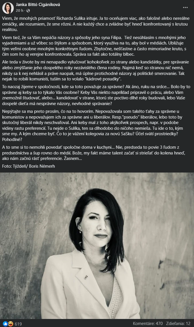 V novej SaS sa schyľuje k otvorenej vojne. Poslankyňa Jana Bittó Cigániková, kedysi považovaná za Sulíkovu najbližšiu osobu v strane, sa na sociálnej sieti nečakane tvrdo pustila do vlastného predsedu Branislava Gröhlinga. Dôvodom je otázka, či má mať Richard Sulík miesto na kandidátke, keďže jeho syn Filip dlhodobo púta pozornosť kontroverznými vyjadreniami a podľa Gröhlinga tým poškodzuje stranu.