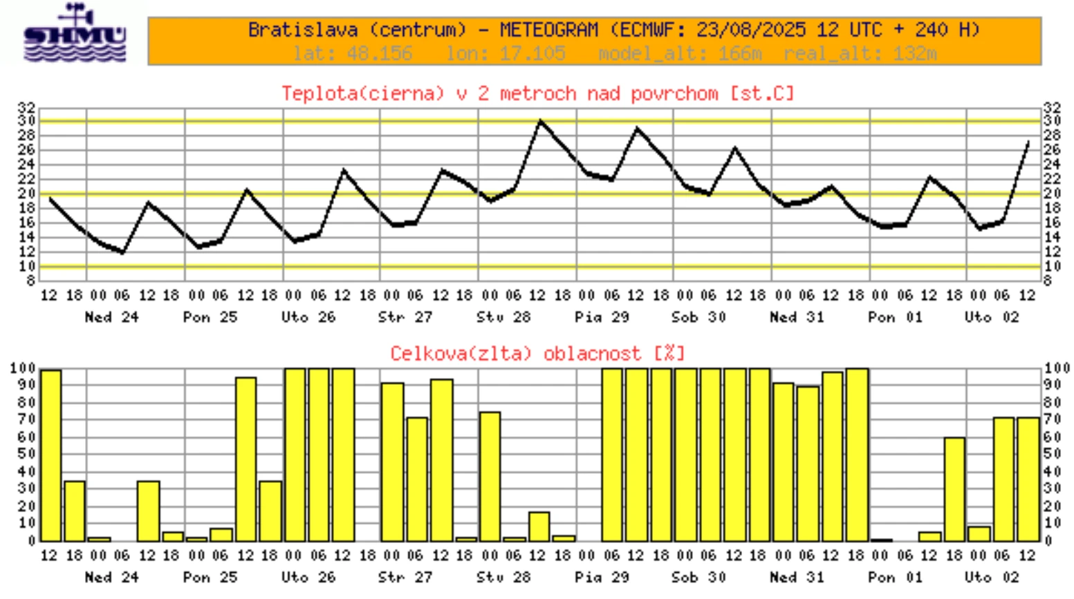 Zatiaľ čo začiatok týždňa ešte prinesie len mierne oteplenie, od utorka by sa maximálne denné teploty mali dostať nad 25 °C. Podľa meteogramu SHMÚ bude v Bratislave a okolí najteplejší štvrtok a piatok, kedy teplota dosiahne viac ako 30 °C.