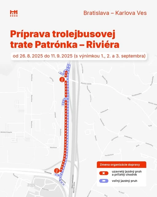 „Dnes (21. 8., pozn. red.) končí prvá etapa prác výstavby novej trolejbusovej trate, ktorá si vyžiadala aj obmedzenie jazdných pruhov na Botanickej ulici. Od 21. augusta v obedňajších hodinách budú všetky jazdné pruhy sprejazdnené. Ospravedlňujeme sa za spôsobené dopravné komplikácie, ktoré na tomto frekventovanom úseku vznikli. Práce na prvej etape zhotoviteľ ukončil načas a doprava do a z Karlovej Vsi by opäť mala byť plynulá. Stavba si vyžiada aj ďalšie dočasné obmedzenia, nepredpokladáme však, že budú mať taký dopad na dopravu, ako na Botanickej. Ďakujeme za vašu trpezlivosť a pochopenie!“