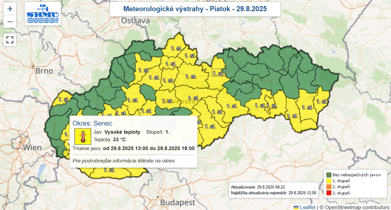Vlna horúčav sa vracia. Meteorológovia vydali výstrahy pred vysokou teplotou pre okresy Senec a Pezinok. Výstraha prvého stupňa platí od 13:00 do 18:00 hod. Informuje o tom Slovenský hydrometeorologický ústav.