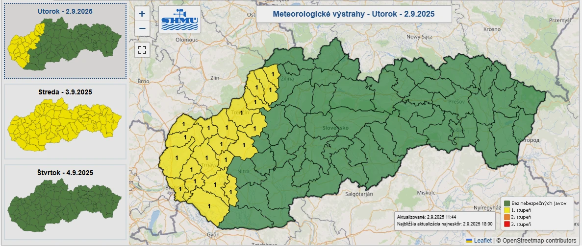 Slovenský hydrometeorologický ústav (SHMÚ) vydal pre okres Bratislava výstrahu 1. stupňa pred búrkami sprevádzanými dažďom. Platí od utorka večera až do stredajšieho rána a platí pre všetky okresy vrátane Malaciek, Pezinka a Senca. Hrozí tak, že niektoré úseky v Bratislave budú znovu pod vodou, ako napríklad problémová Račianska ulica.