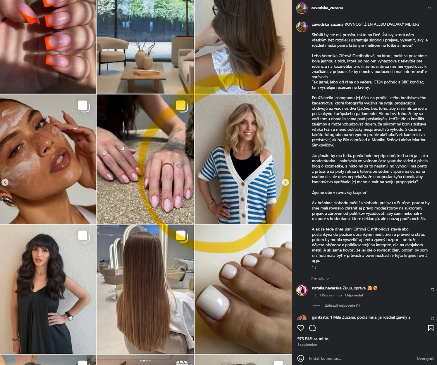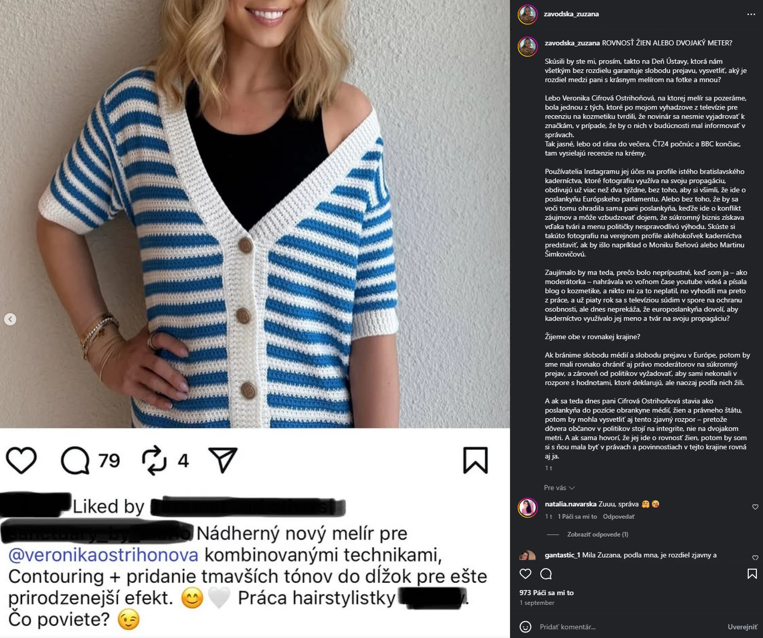 Závodská svoj status nazvala provokatívne: „ROVNOSŤ ŽIEN ALEBO DVOJAKÝ METER?“ a následne si nebrala servítku pred ústa. „Skúsili by ste mi, prosím, takto na Deň Ústavy… vysvetliť, aký je rozdiel medzi pani s krásnym melírom na fotke a mnou?“ pýtala sa otvorene.