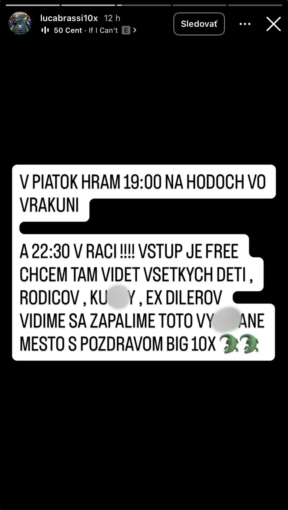 Kontroverziu spustili príspevky, ktoré Brassi krátko pred vystúpením zverejnil na Instagrame a po pár hodinách aj zmazal. „V piatok hrám 19:00 na Hodoch vo Vrakuni. A 22:30 v Rači! Vstup je free, chcem tam vidieť všetkých. Deti, rodičov, ku**y, ex dílerov. Vidíme sa, zapálime toto vy**bané mesto. S pozdravom BIG 10X,“* pozýval dosť netradične návštevníkov na prevažne rodinné akcie.