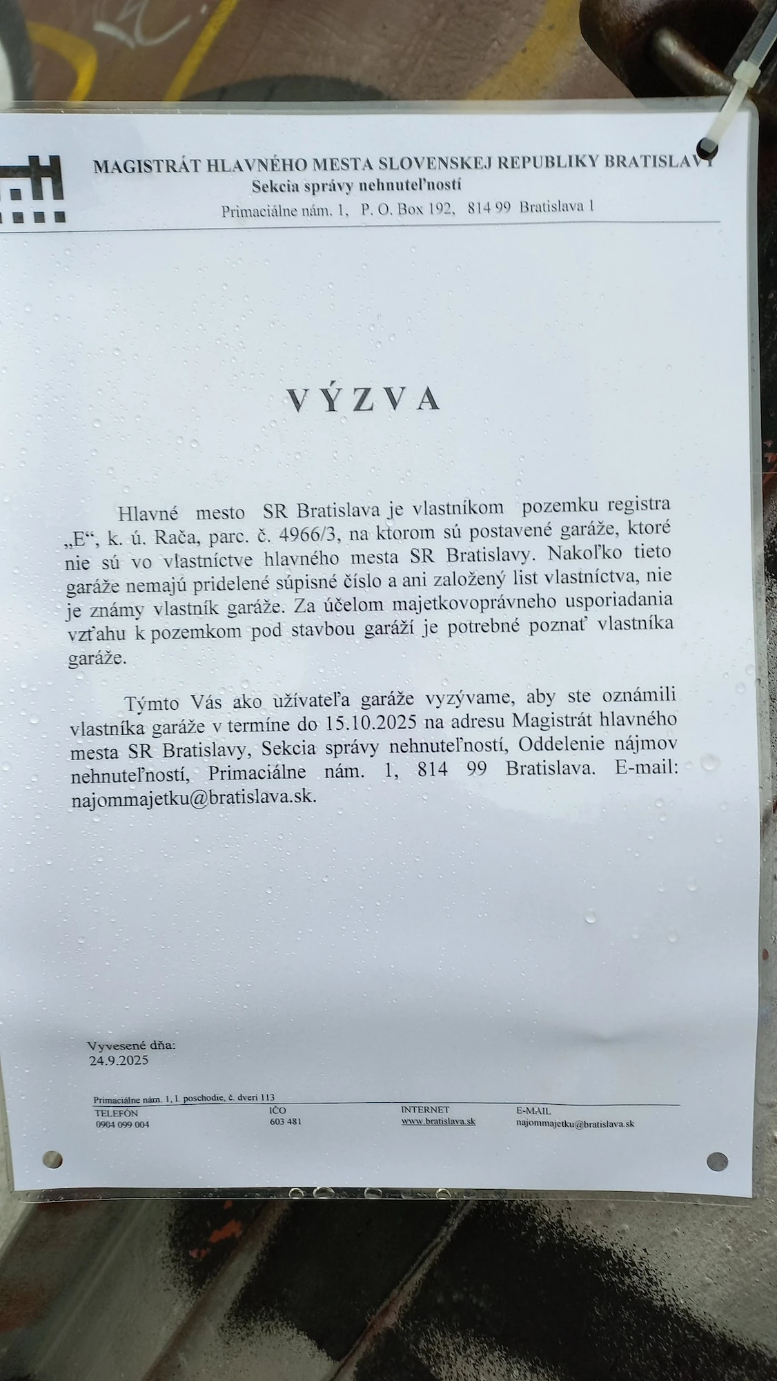 Na garážach za Polygrafickým učilišťom v Bratislave sa v stredu objavilo oznámenie z Magistrátu hlavného mesta SR. Úrad vyzýva všetkých majiteľov a užívateľov garáží, aby do 15. októbra 2025 oznámili vlastnícke vzťahy k svojim nehnuteľnostiam.