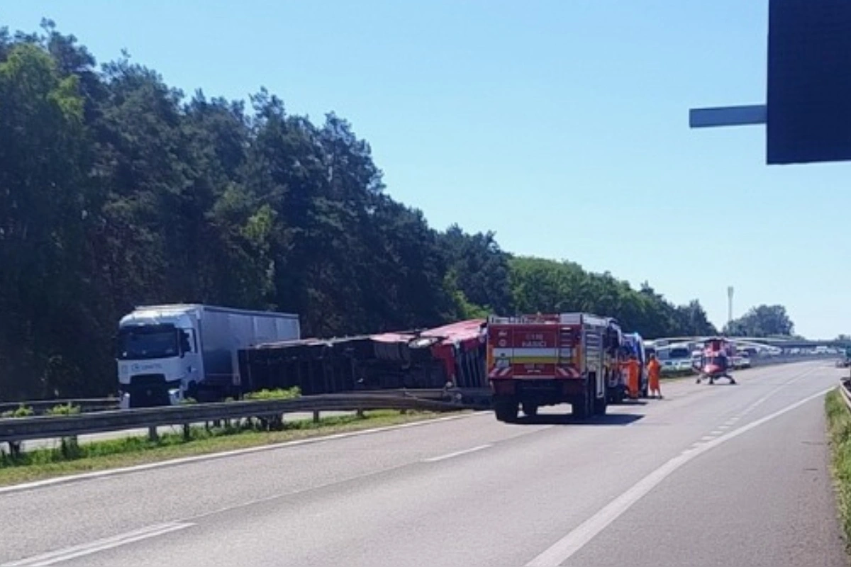 Na D2 sa pred Kútmi smerom do Malaciek prevrátil kamión